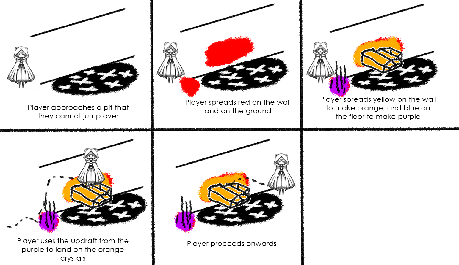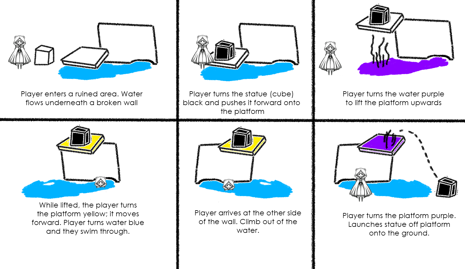 While brainstorming the game’s colour mechanics, I found it most effective for me to sketch out puzzle scenarios in a storyboard format so that I had a visual descriptor for each of our mechanics. These puzzles weren’t necessarily well developed, but they were good enough that someone could understand the mechanic at a glance. You can see a few of these below: